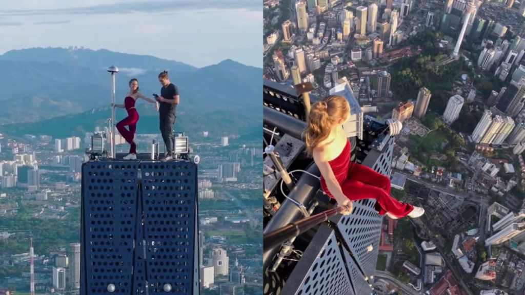 Malaysia’s capital Kuala Lumpur Stunt on the world’s tallest building and the Russian couple got overshadowed construction day Rain Marathe’s stand on top of Merdeka Tower,